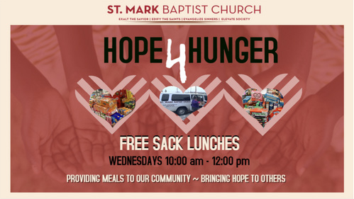 The St. Mark Hope for Hunger program prepares and provides free sack lunches for those in need in our community every Wednesday from 12 PM to 2 PM. In addition, we offer free community meals during the summer and hold clothing drives (including children's coats, socks, and underwear) during the winter months.